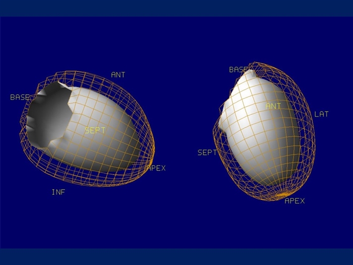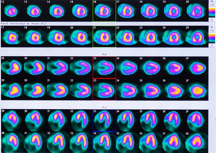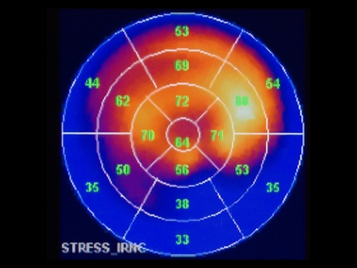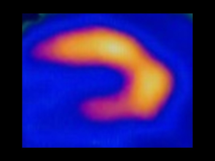 ↓実際の心筋シンチの画像。 心臓の左心室の筋肉の血のめぐりの悪いところを見つけます。