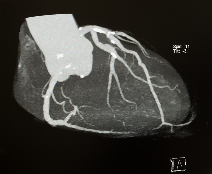 ↓心臓CTで撮影した冠動脈(かんどうみゃく)。動脈硬化で血管についたカルシウムが白くみえます。